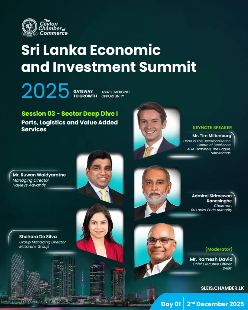 As Sri Lanka positions itself as a strategic hub in the Indian Ocean, the ports and logistics sector remains central to driving trade, attracting investment, and unlocking regional connectivity. Yet the next phase of growth cannot be built on scale alone – it must also align with global sustainability imperatives. On Day One (2nd December) of the Sri Lanka Economic & Investment Summit 2025, the sector deep dive “Ports and Logistics: Building a Competitive and Climate-Resilient Ecosystem” will explore how the industry can modernise to meet these dual demands.
